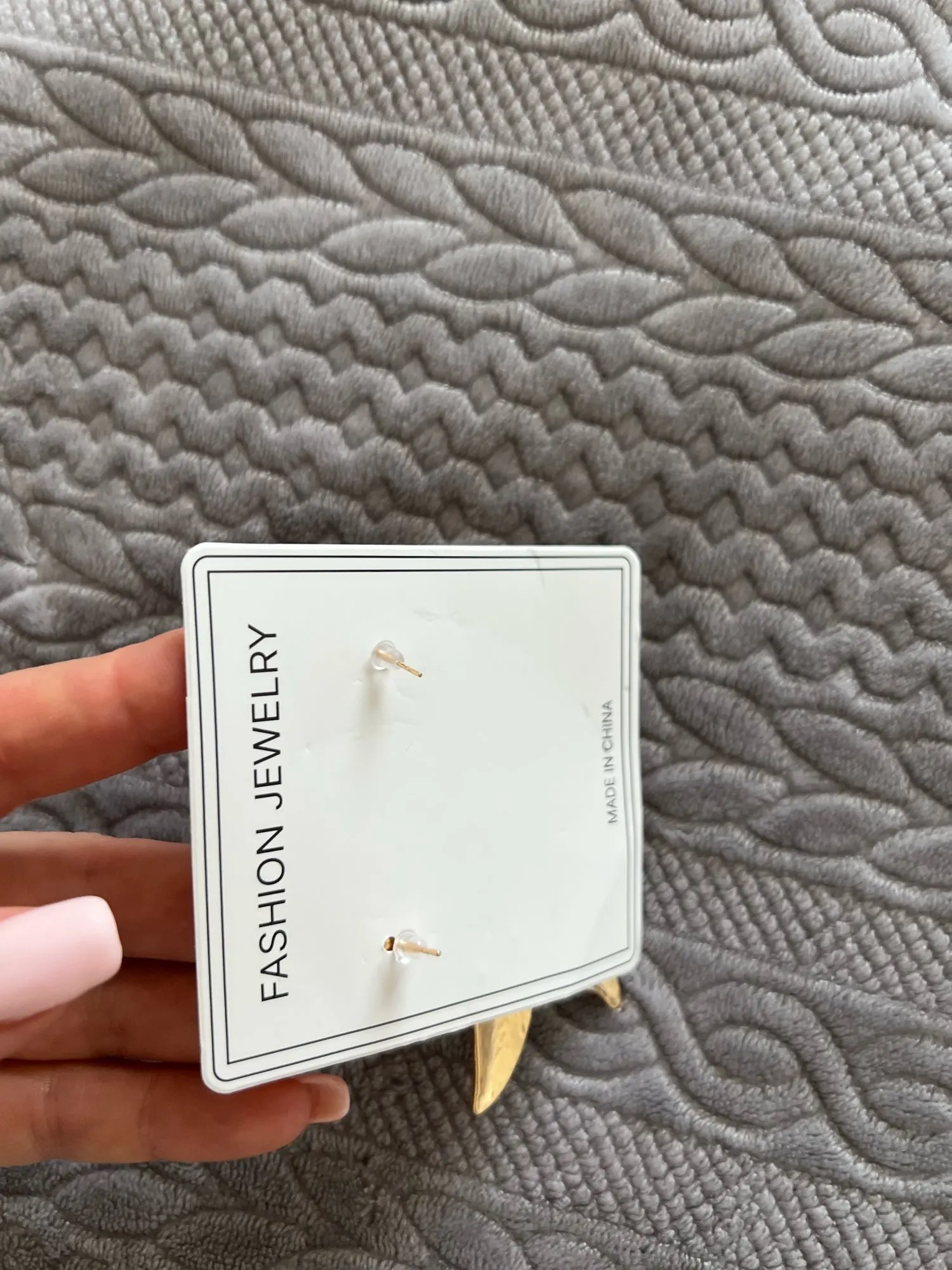 Beautiful earrings, came in three weeks in Peter. Material metal, not heavy. Color light gold