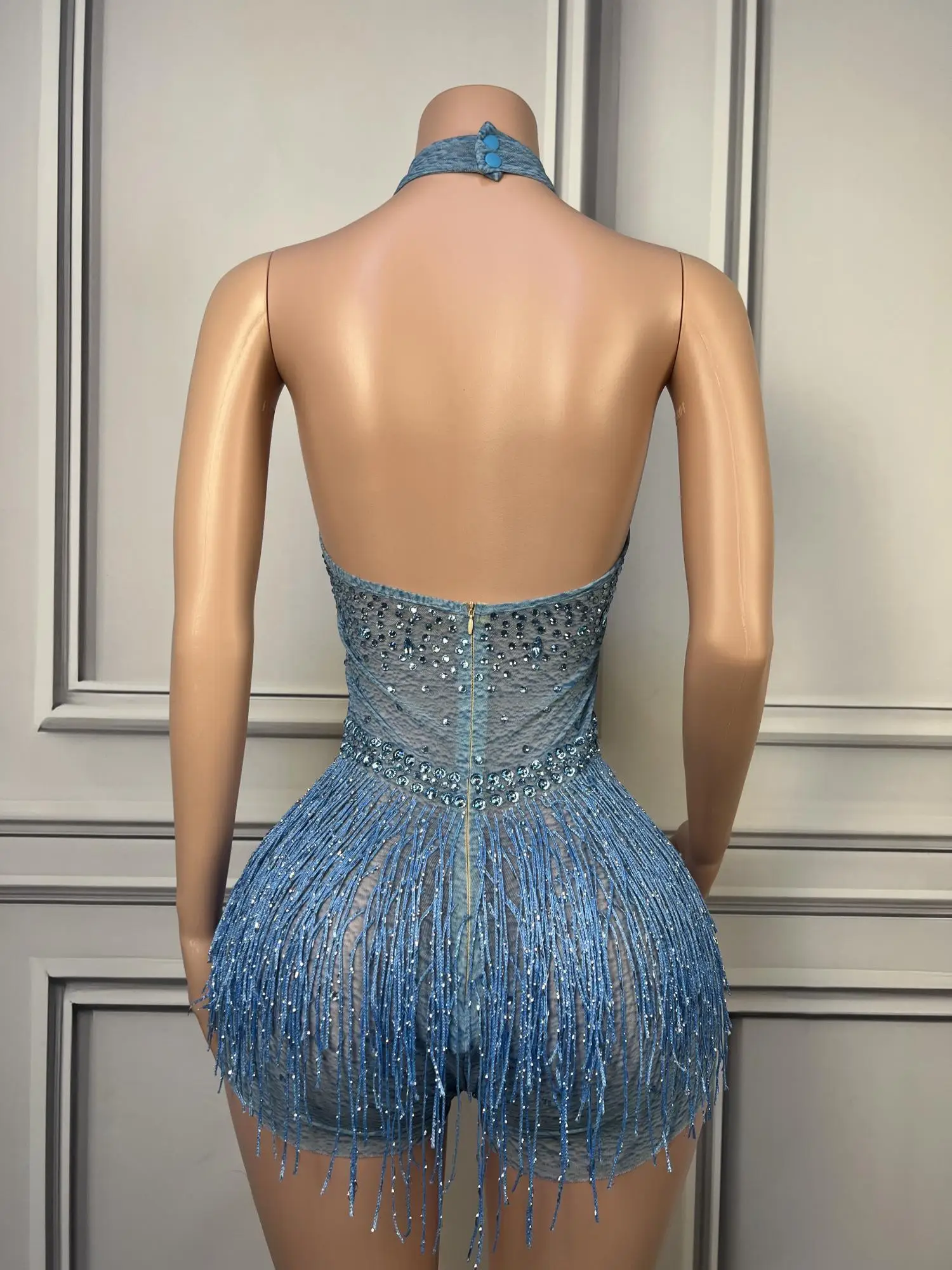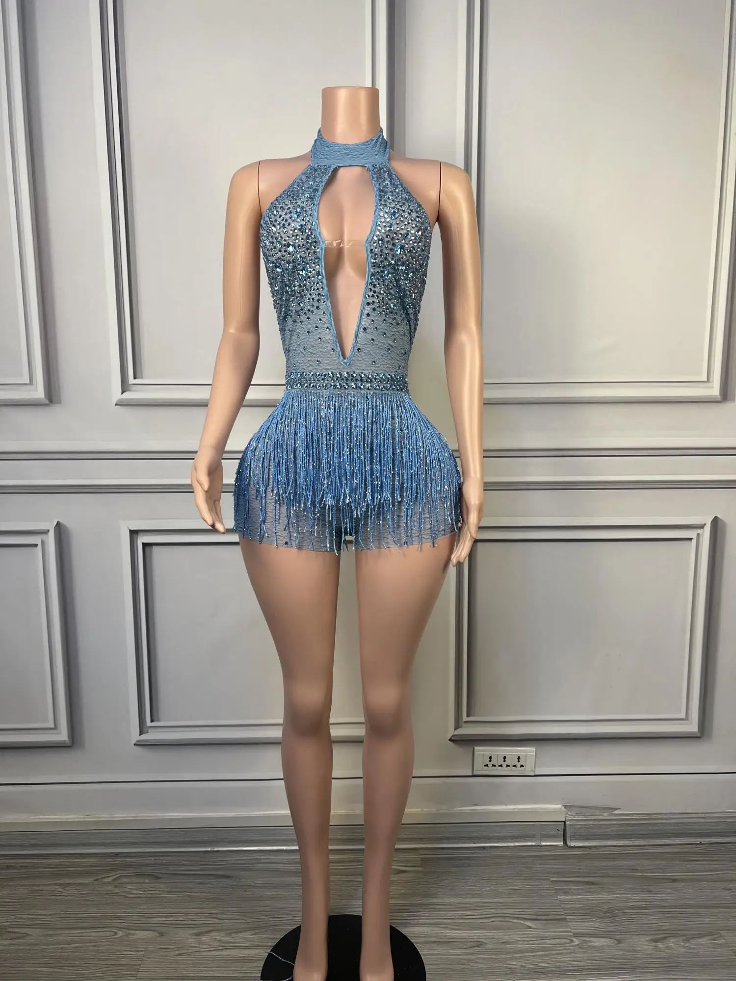 Sparkly Rhinestones Sequins Tassel LeotardWomen Nightclub Outfit Singer Dancer CostumeStage Wear Sexy Performance Bodysuit 7G 1
