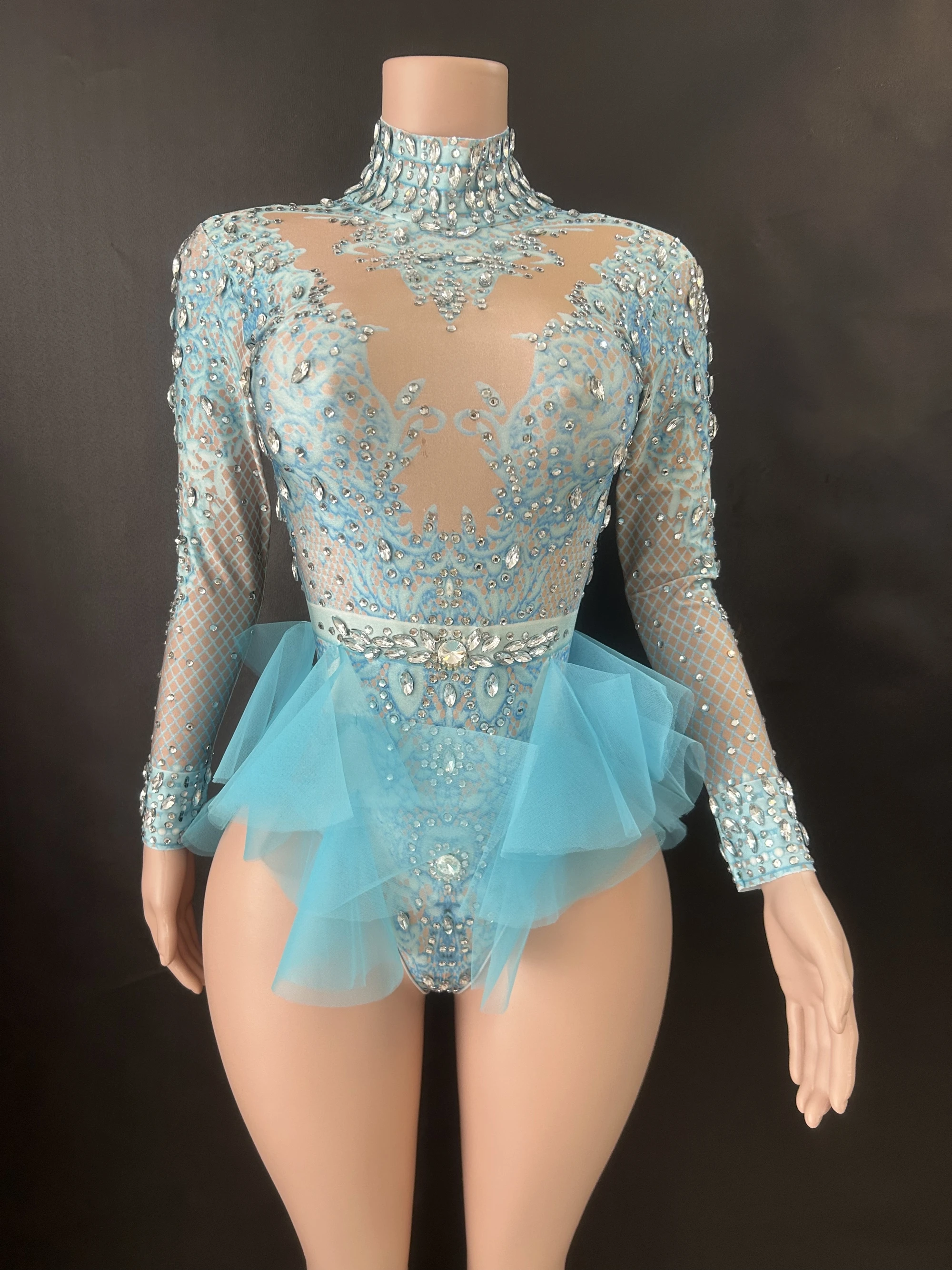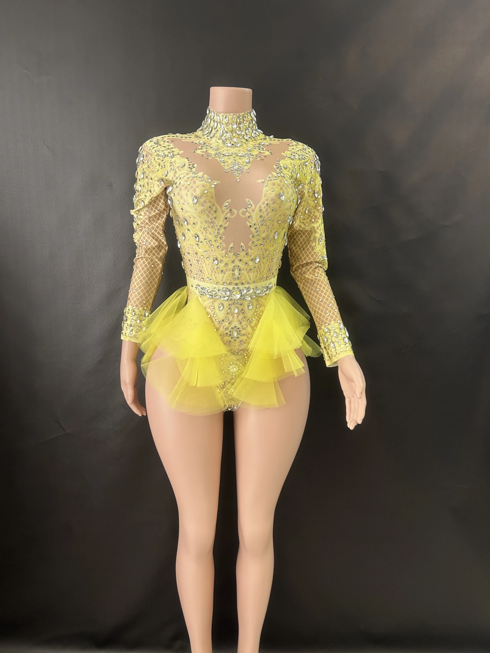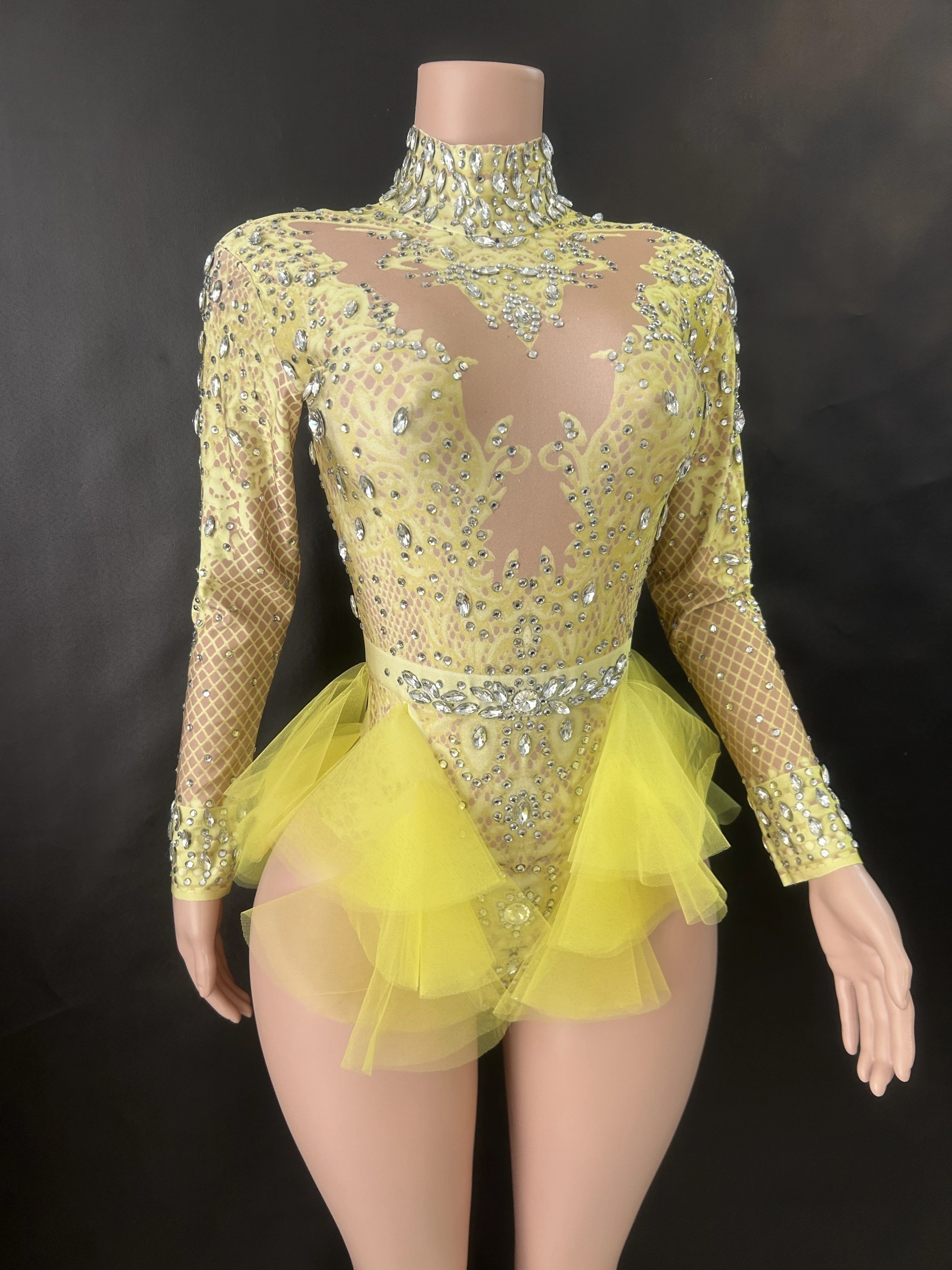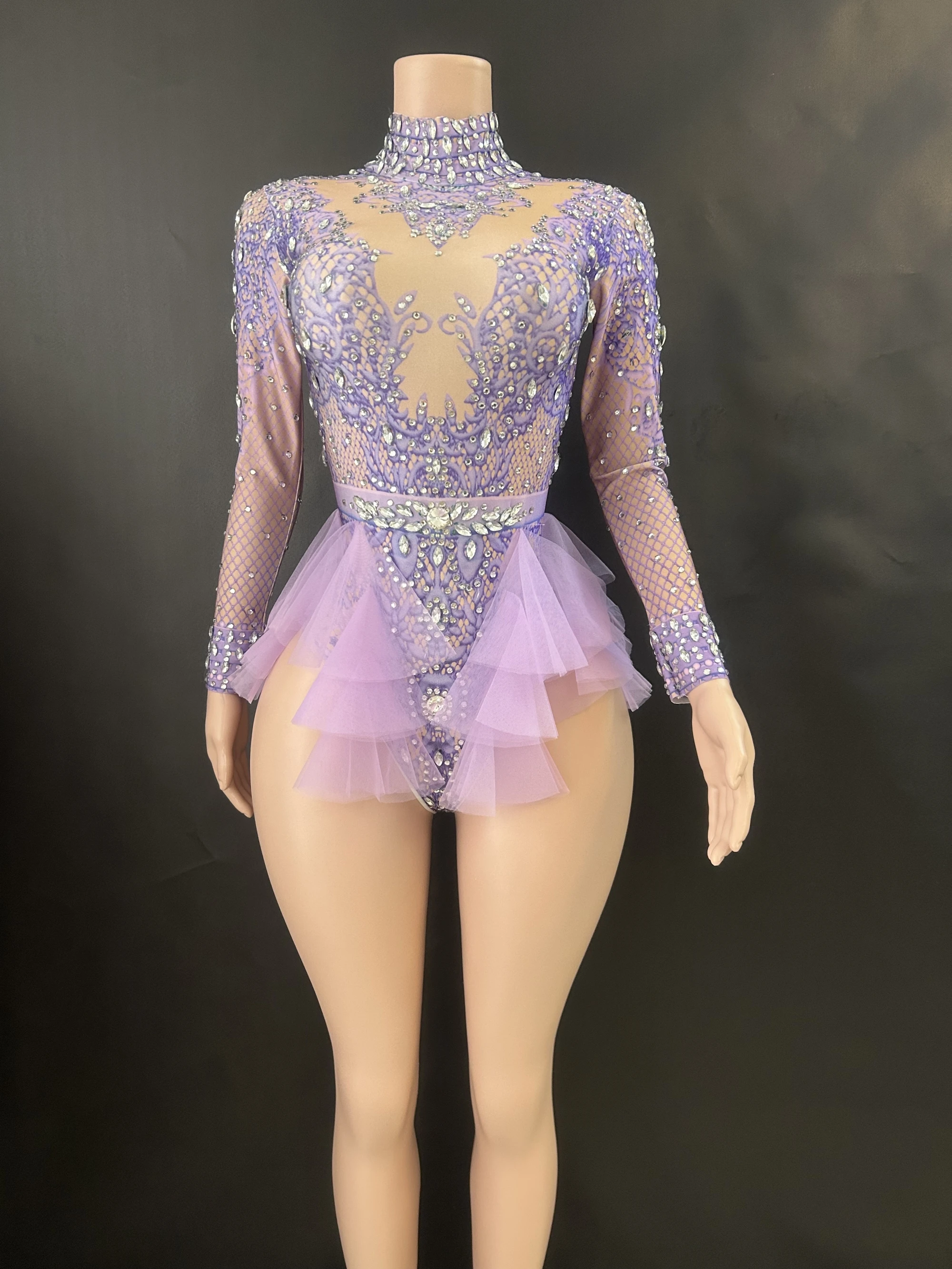 1 review for Sparkly Rhinestones Bodysuit Women ElasticPink Mesh Ruffles Crystal Leotard NightclubDancer Costume Stage Wear Party Outfit 7G