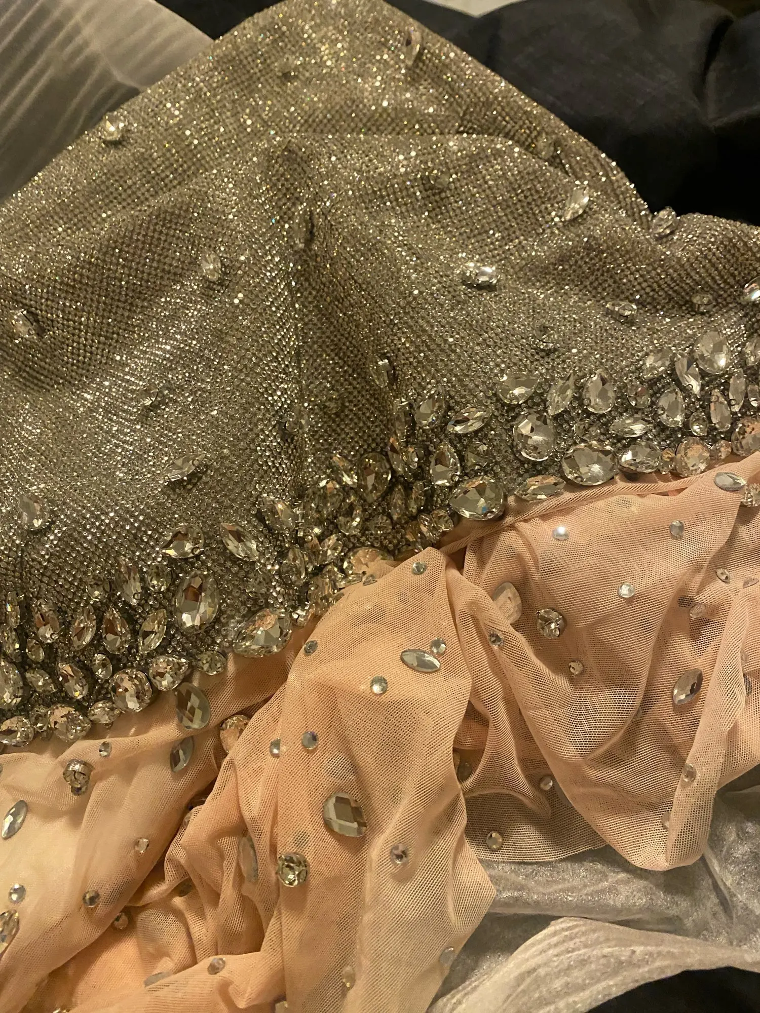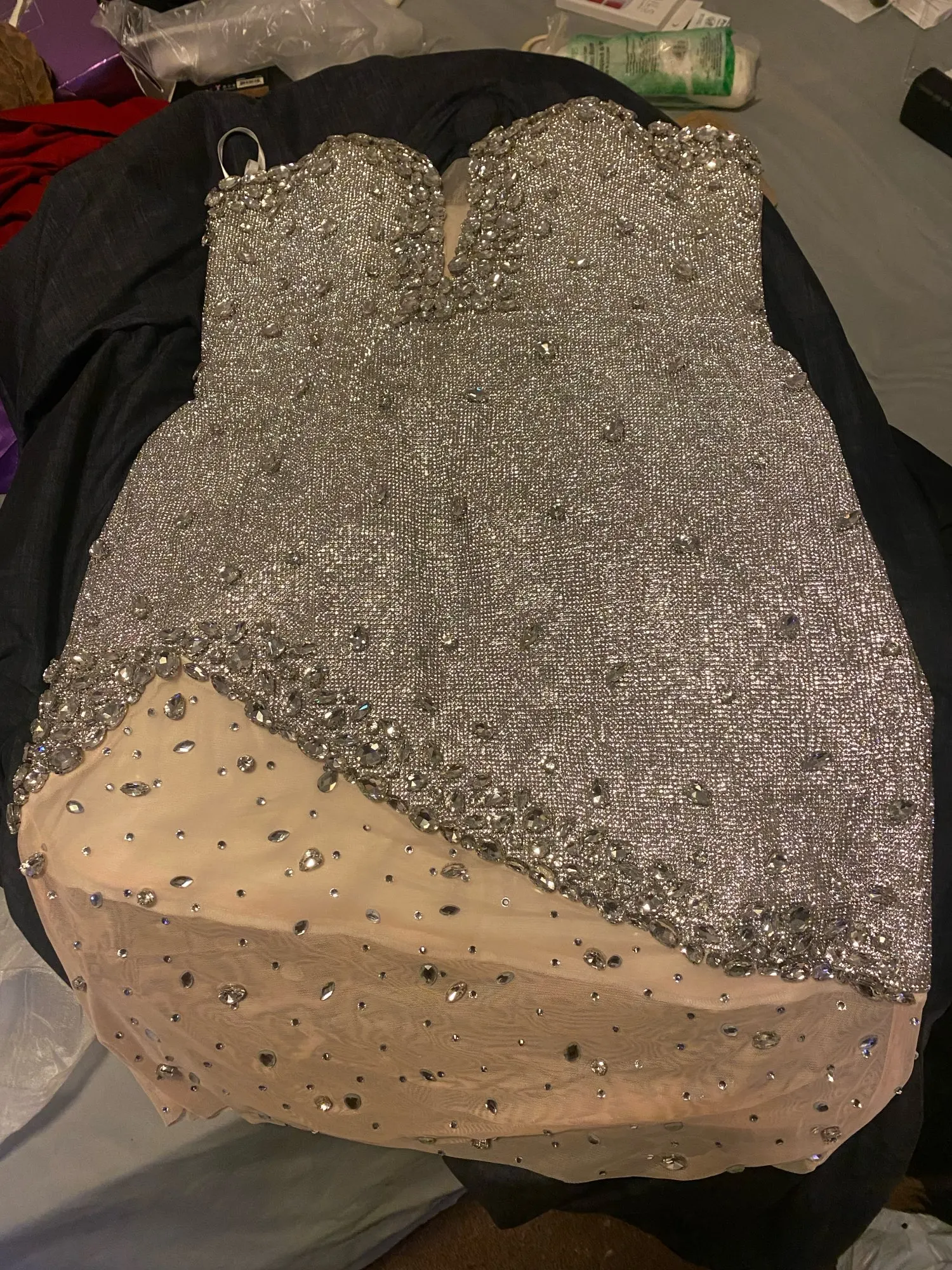 It’s a really beautiful dress, however it’s small and doesn’t fit me. it’s got no stretch whatsoever. I was a little disappointed because when I opened it, some crystals fell out of the bag.. not sure if they were from the dress or they were spare ones but all in all the dress is lovely