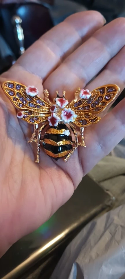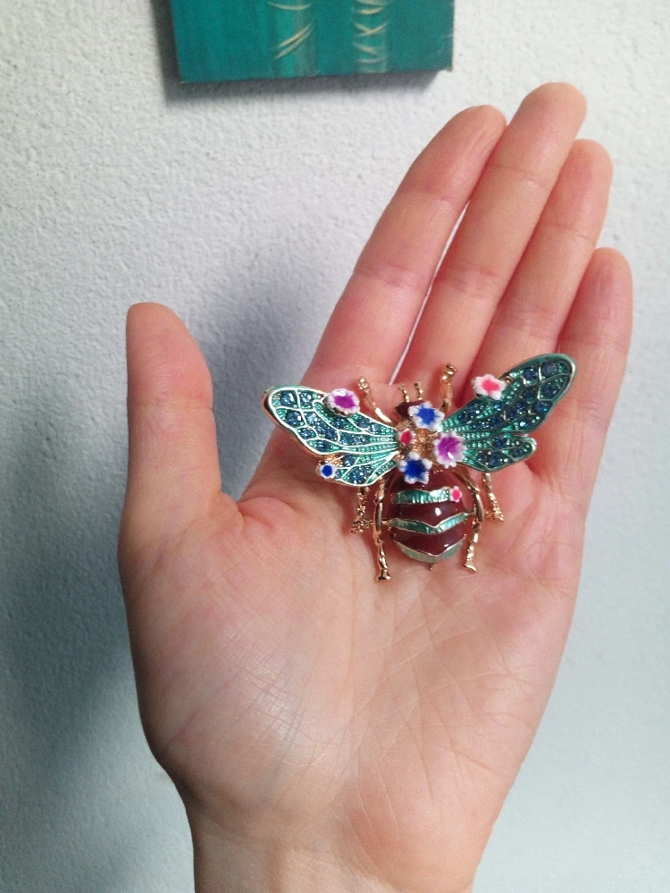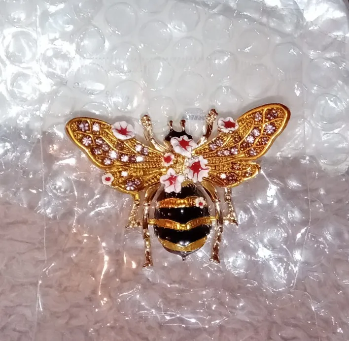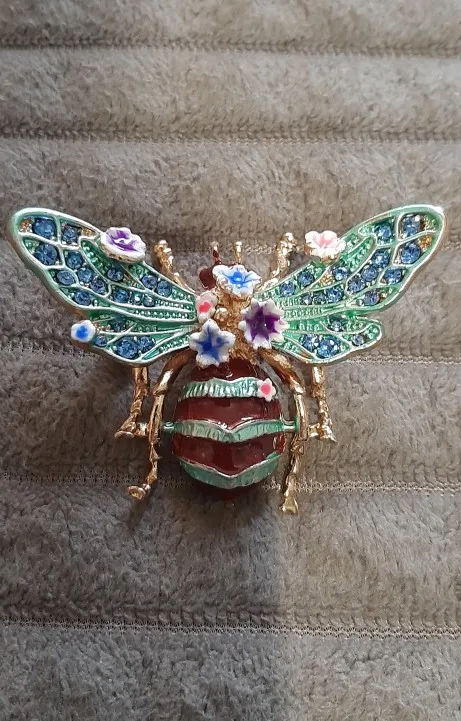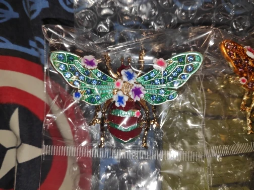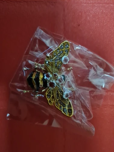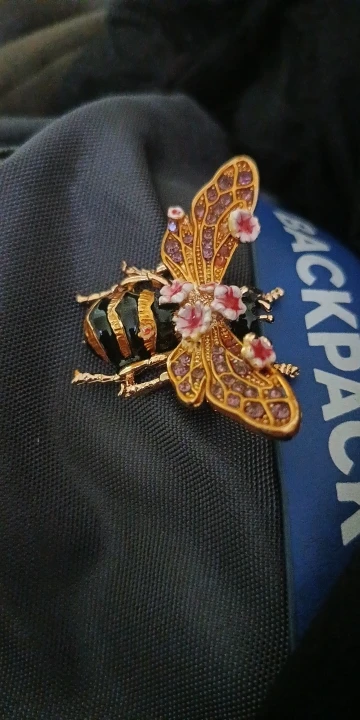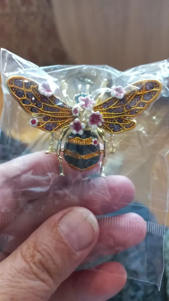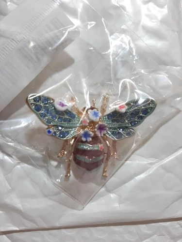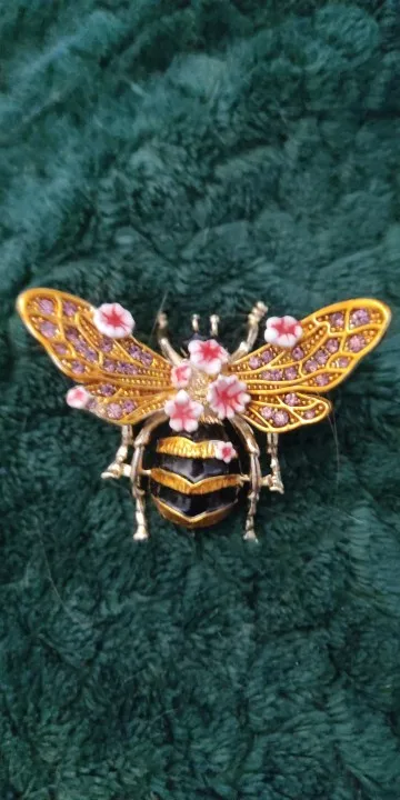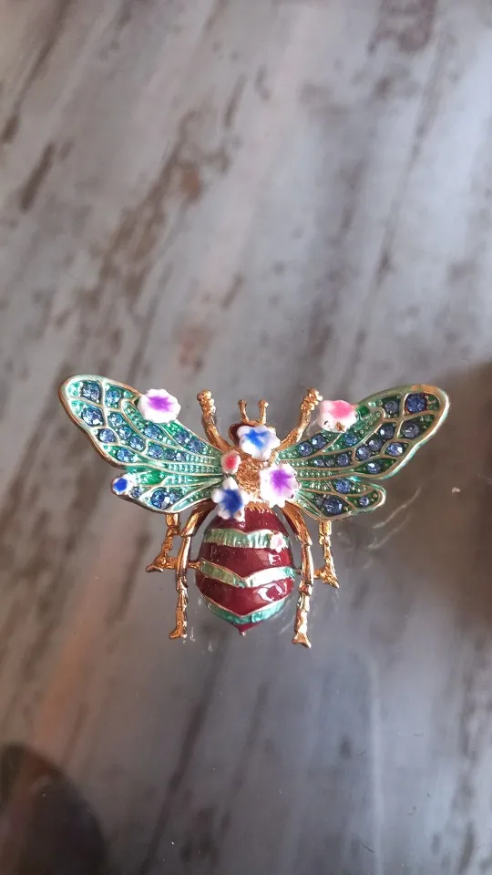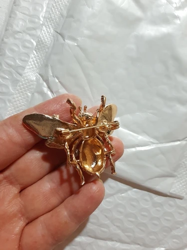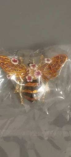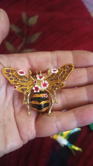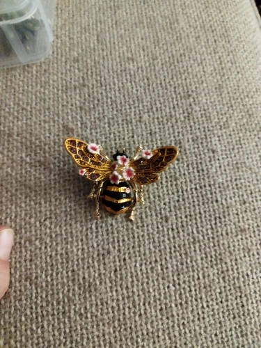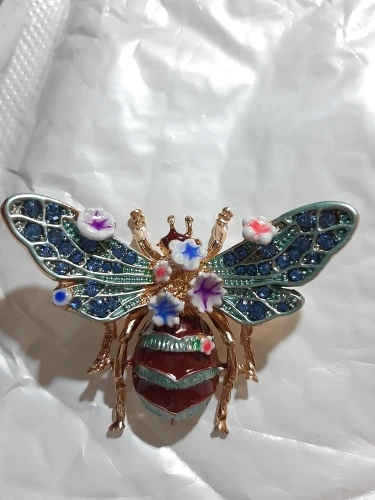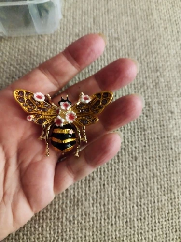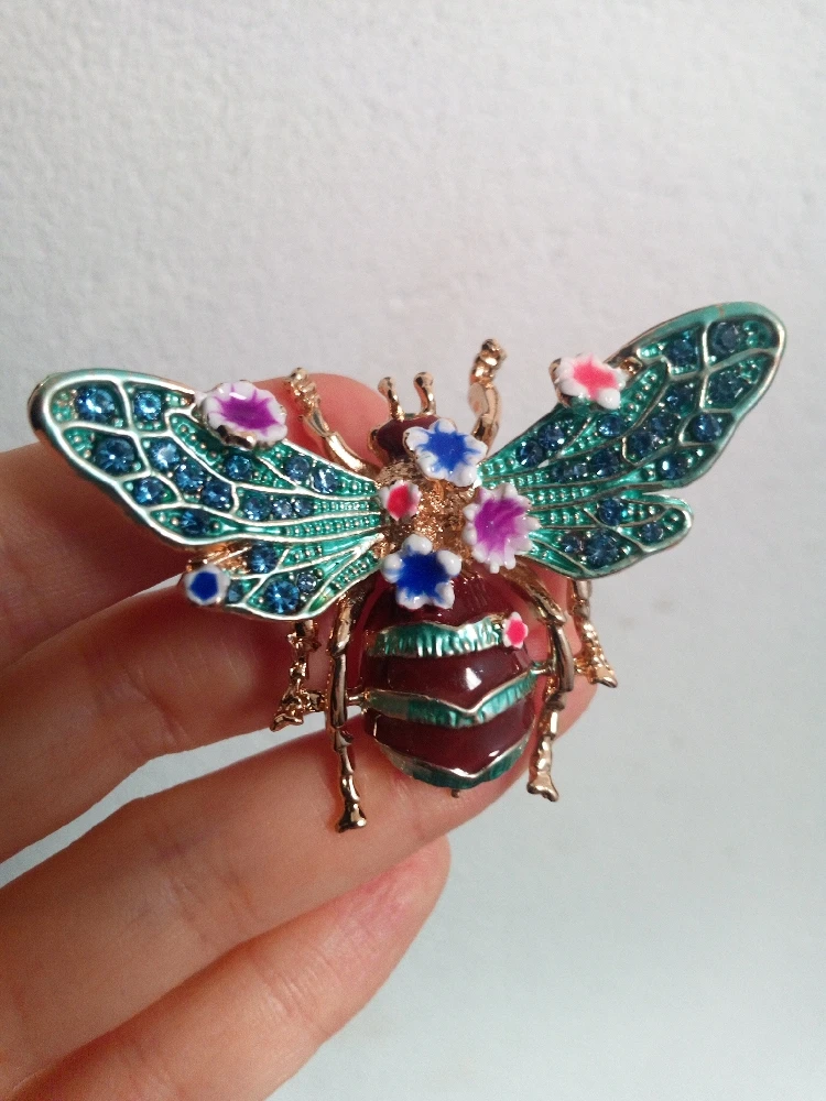 This pin is beautiful! It is very well done, in great detail, even the wings of the Bee have venations, its legs come out of the thorax and not the abdomen and it even has its stinger. The colors are very cute and bright and I like the flowers and the crystals that the insect has… A work of art! The delivery was fast and the packaging was very good. Looks durable. It is somewhat heavy as it is a large pin, but I think that the garment can be held well by placing a piece of foam or something thick on the inside of the garment just where the needle goes through.