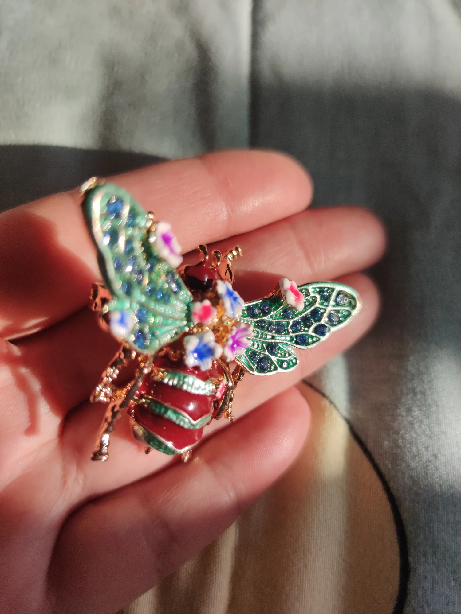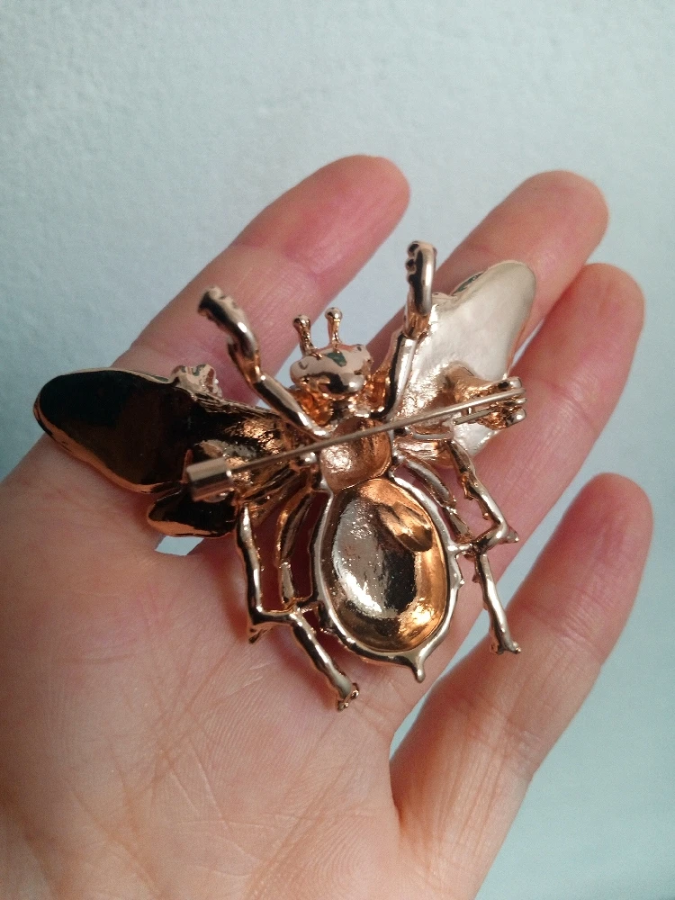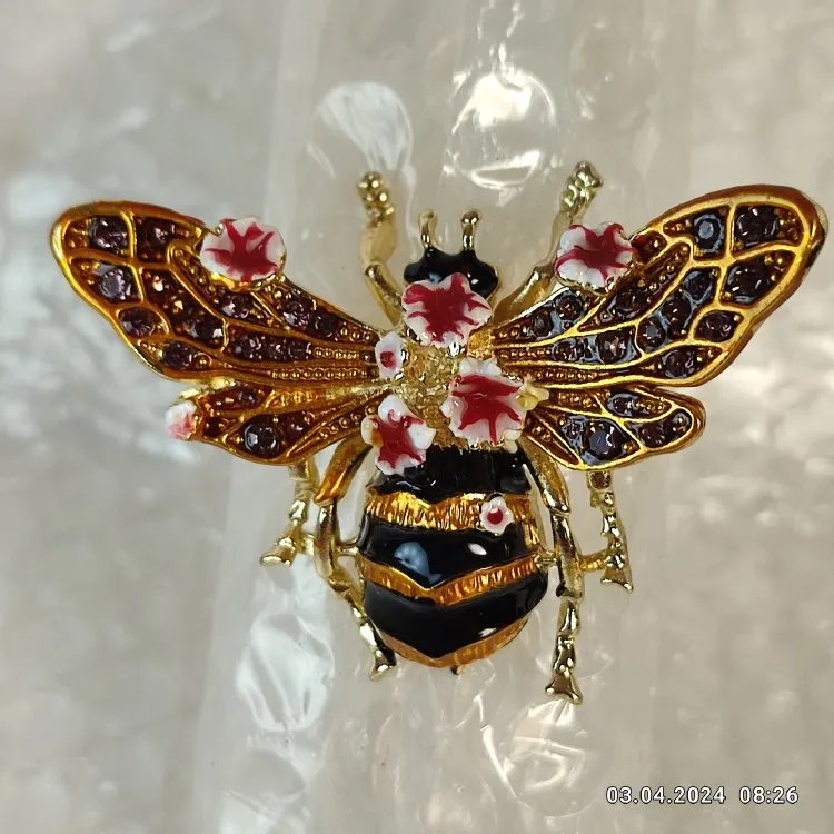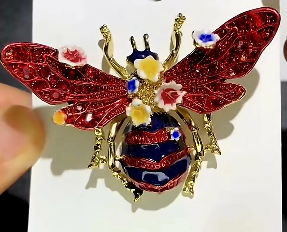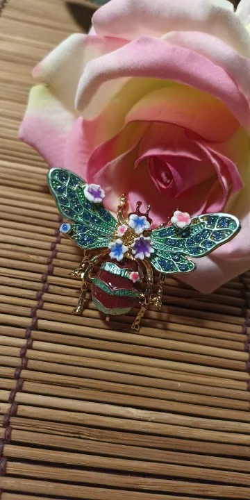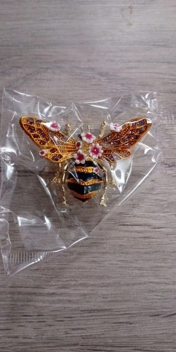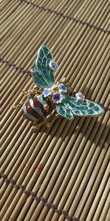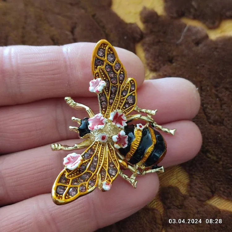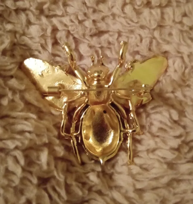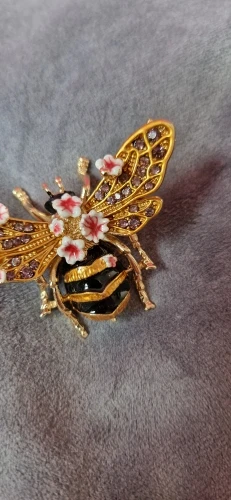 This pin is beautiful! It is very well done, in great detail, even the wings of the Bee have venations, its legs come out of the thorax and not the abdomen and it even has its stinger. The colors are very cute and bright and I like the flowers and the crystals that the insect has… A work of art! The delivery was fast and the packaging was very good. Looks durable. It is somewhat heavy as it is a large pin, but I think that the garment can be held well by placing a piece of foam or something thick on the inside of the garment just where the needle goes through.