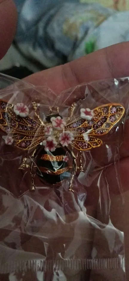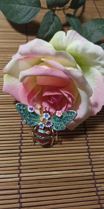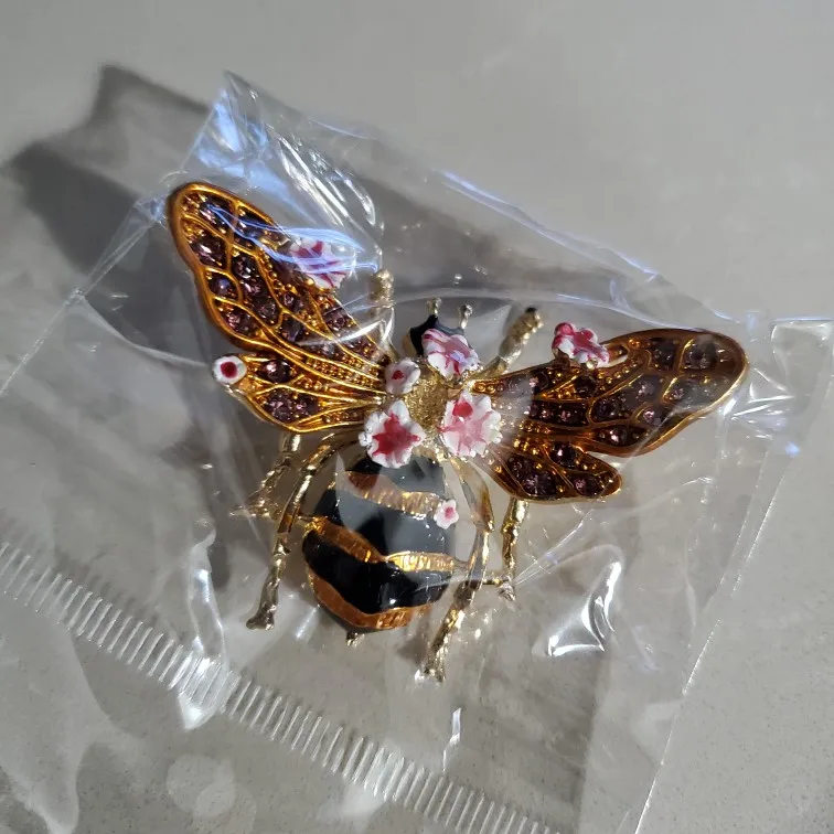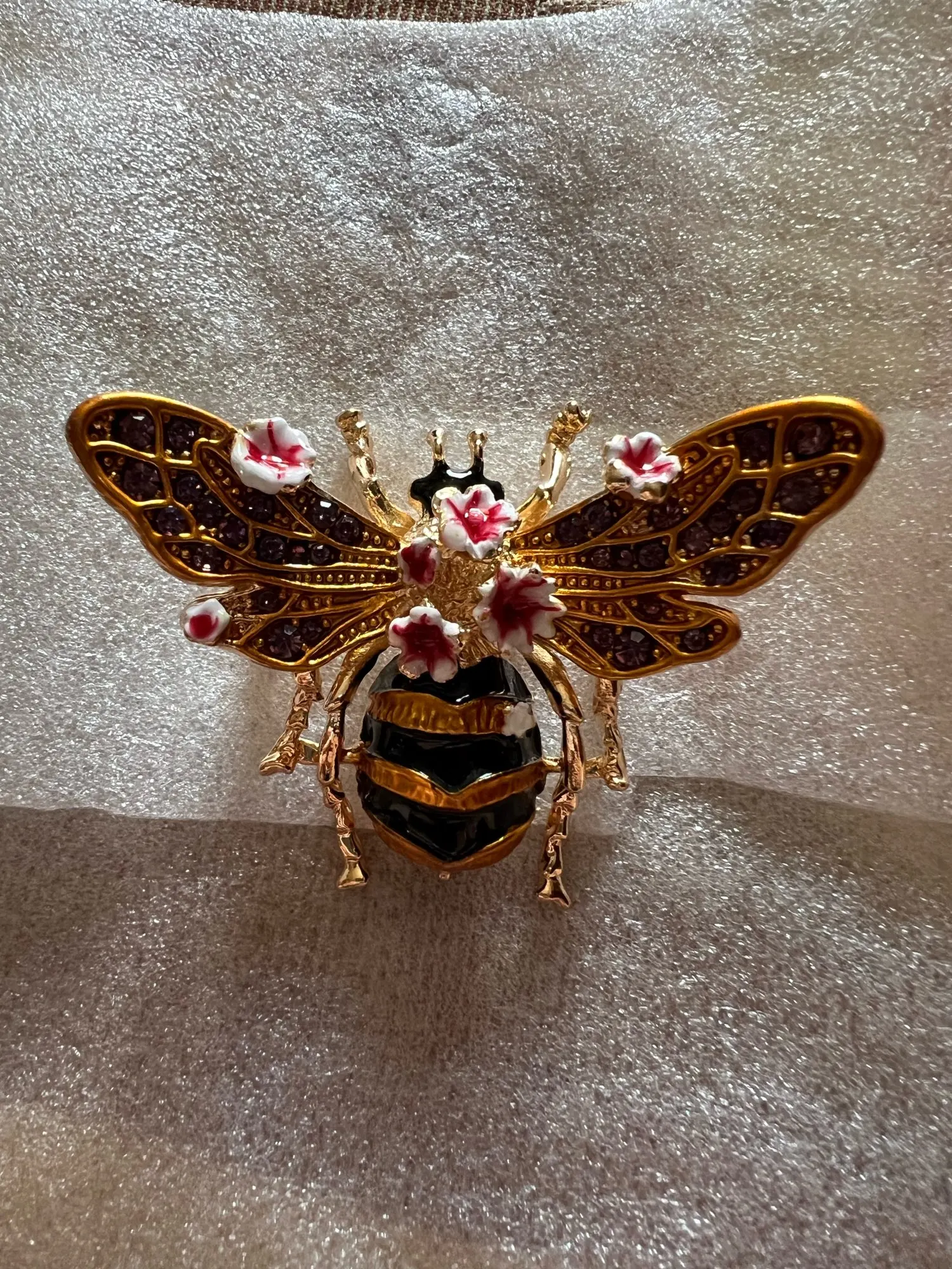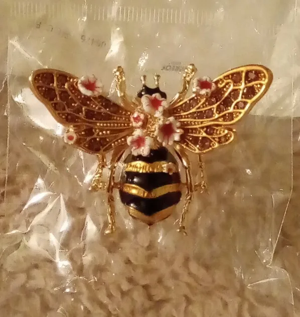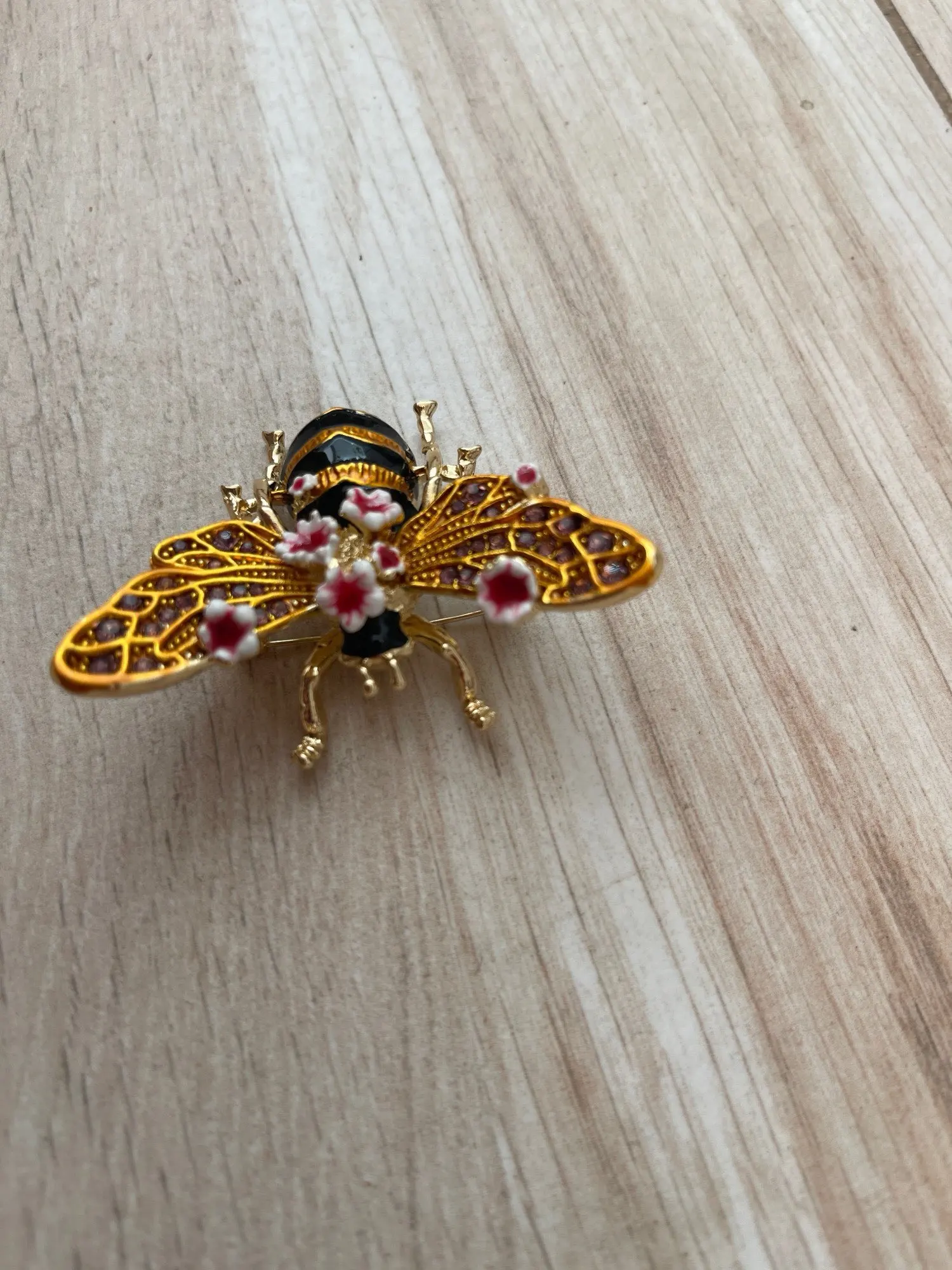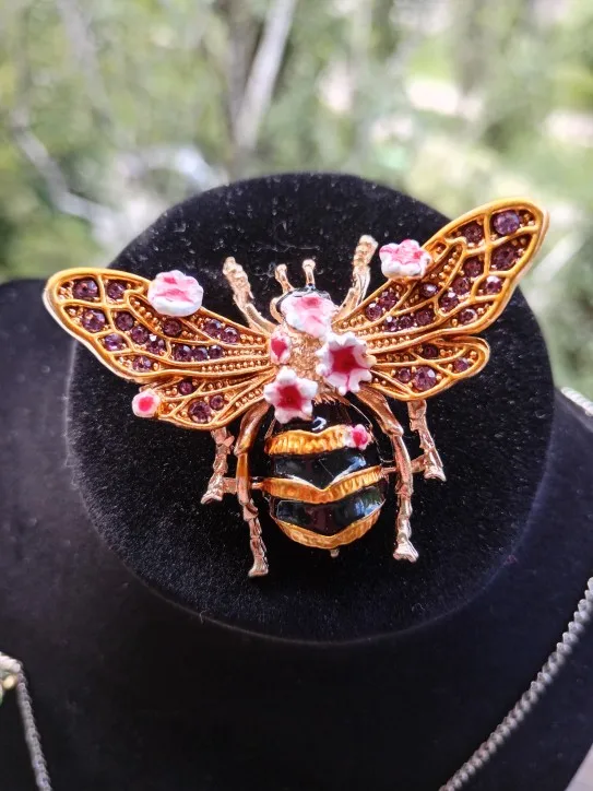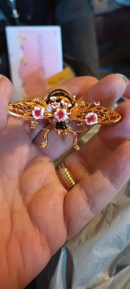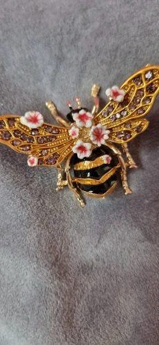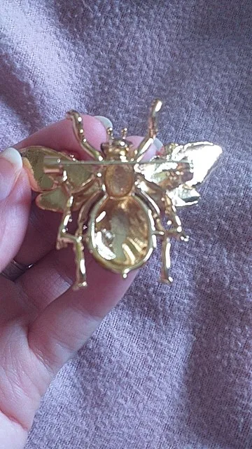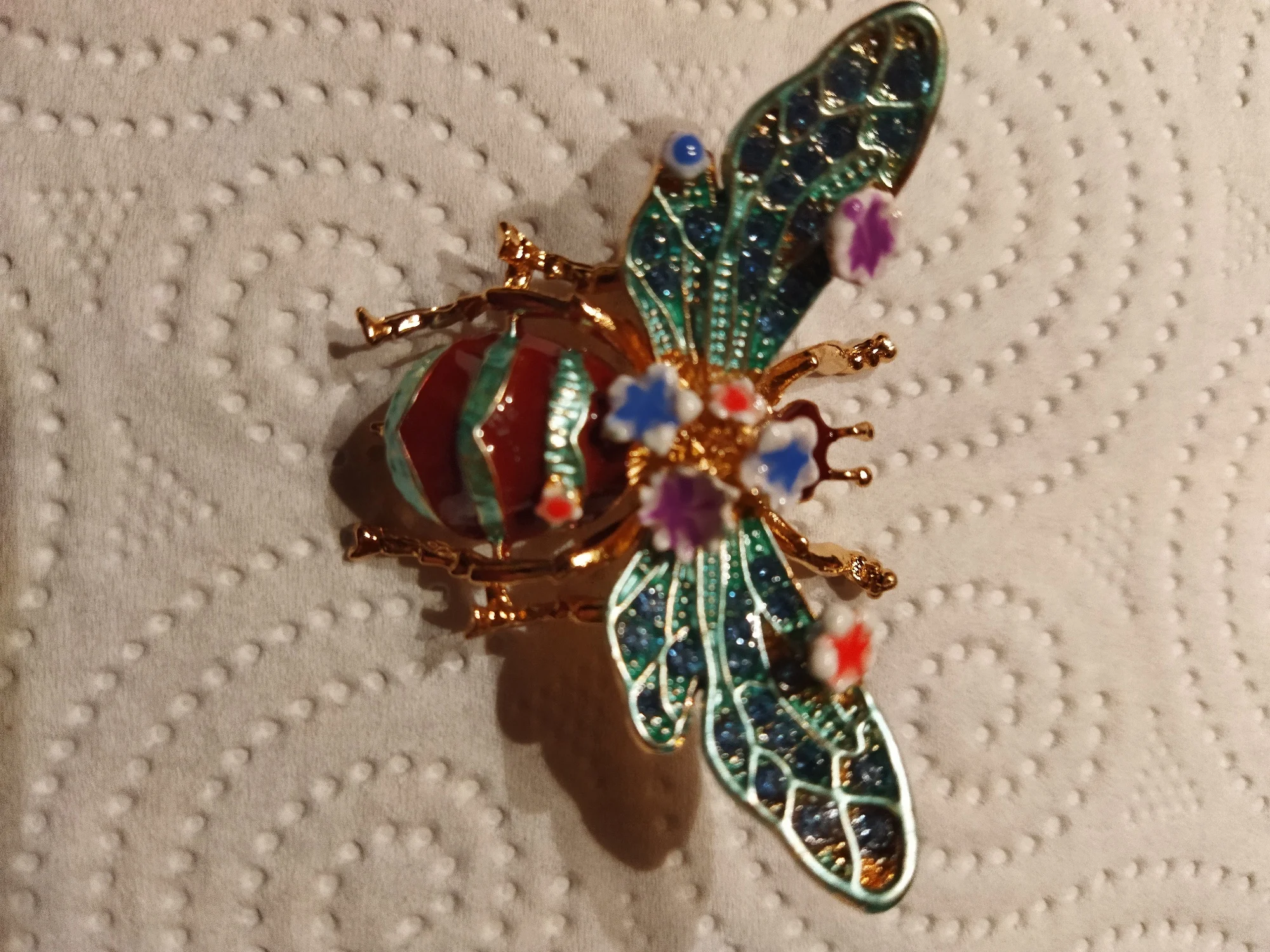 This pin is beautiful! It is very well done, in great detail, even the wings of the Bee have venations, its legs come out of the thorax and not the abdomen and it even has its stinger. The colors are very cute and bright and I like the flowers and the crystals that the insect has… A work of art! The delivery was fast and the packaging was very good. Looks durable. It is somewhat heavy as it is a large pin, but I think that the garment can be held well by placing a piece of foam or something thick on the inside of the garment just where the needle goes through.