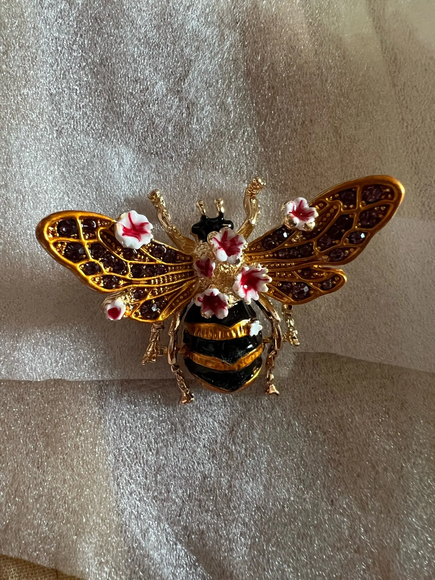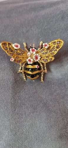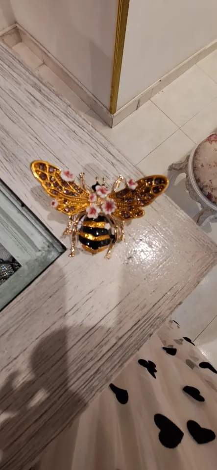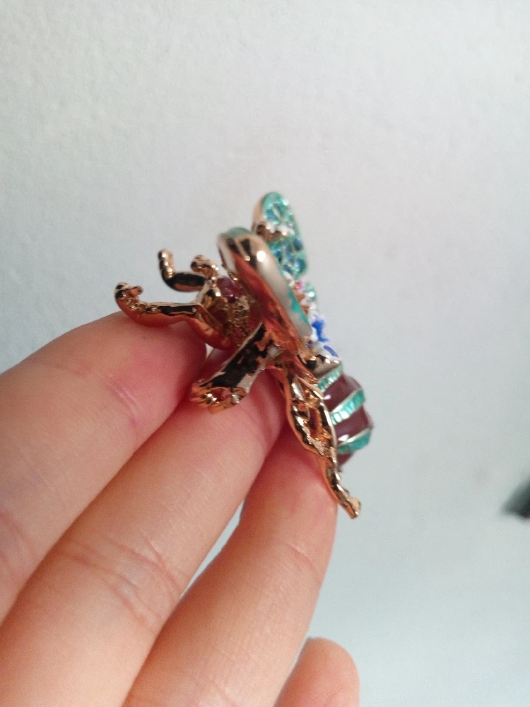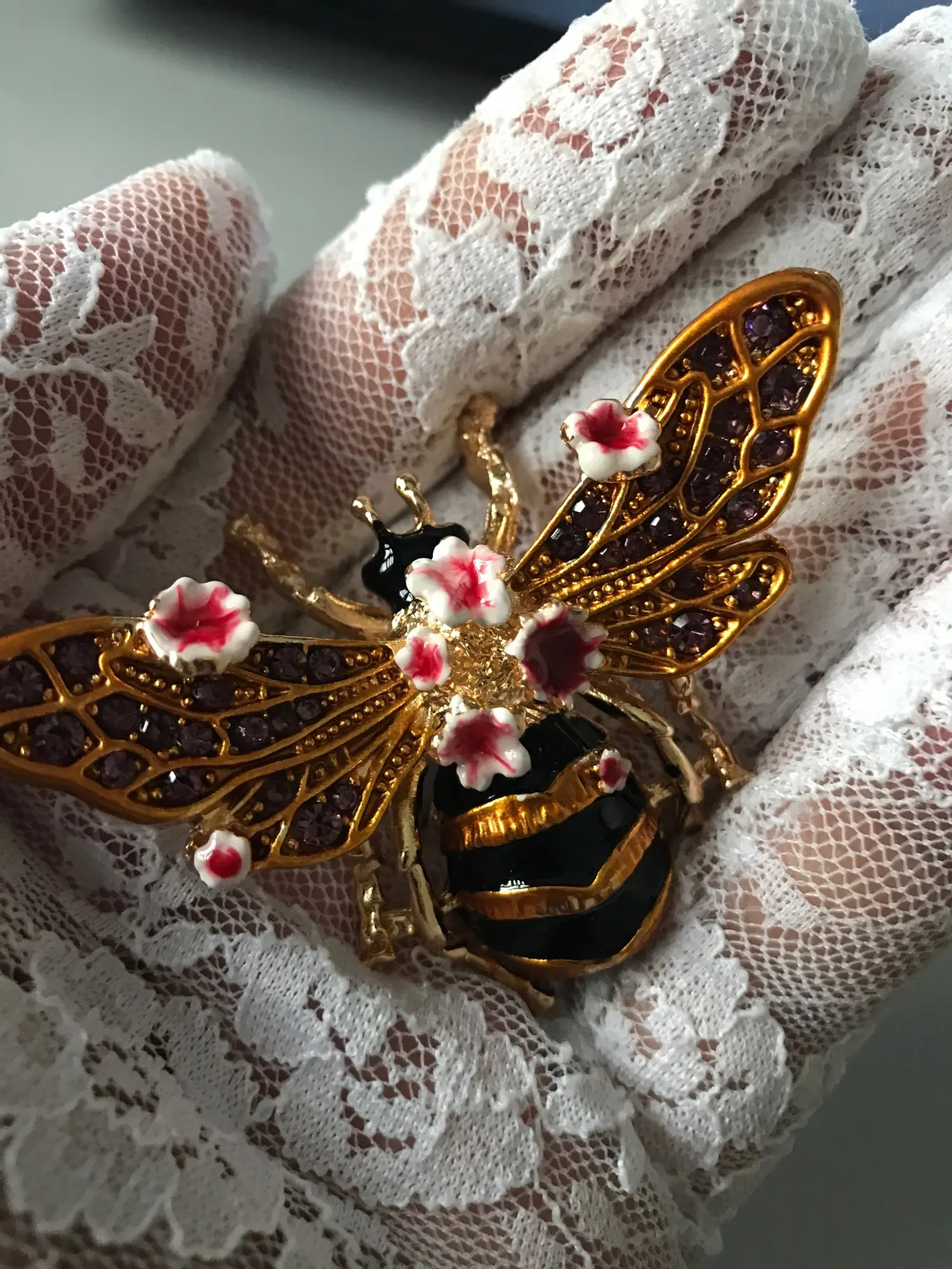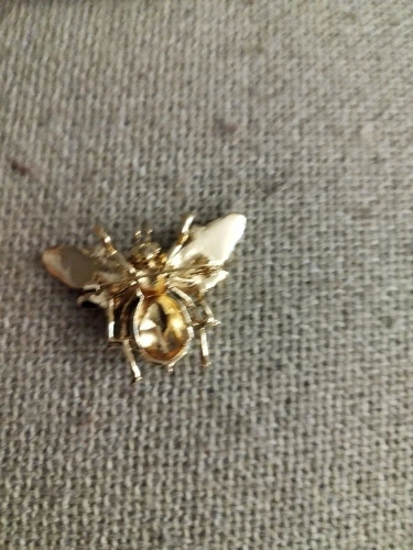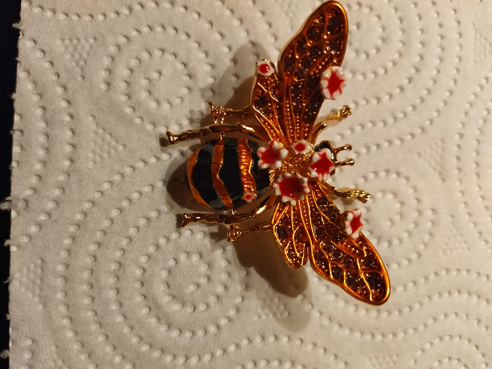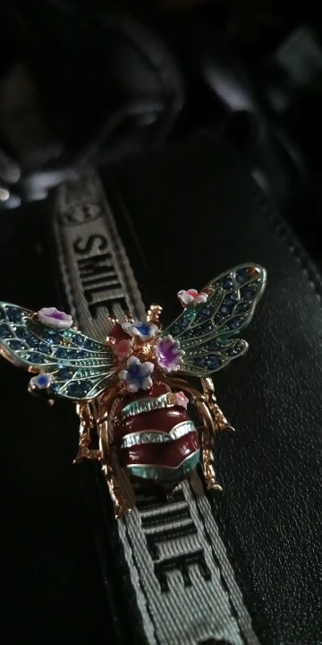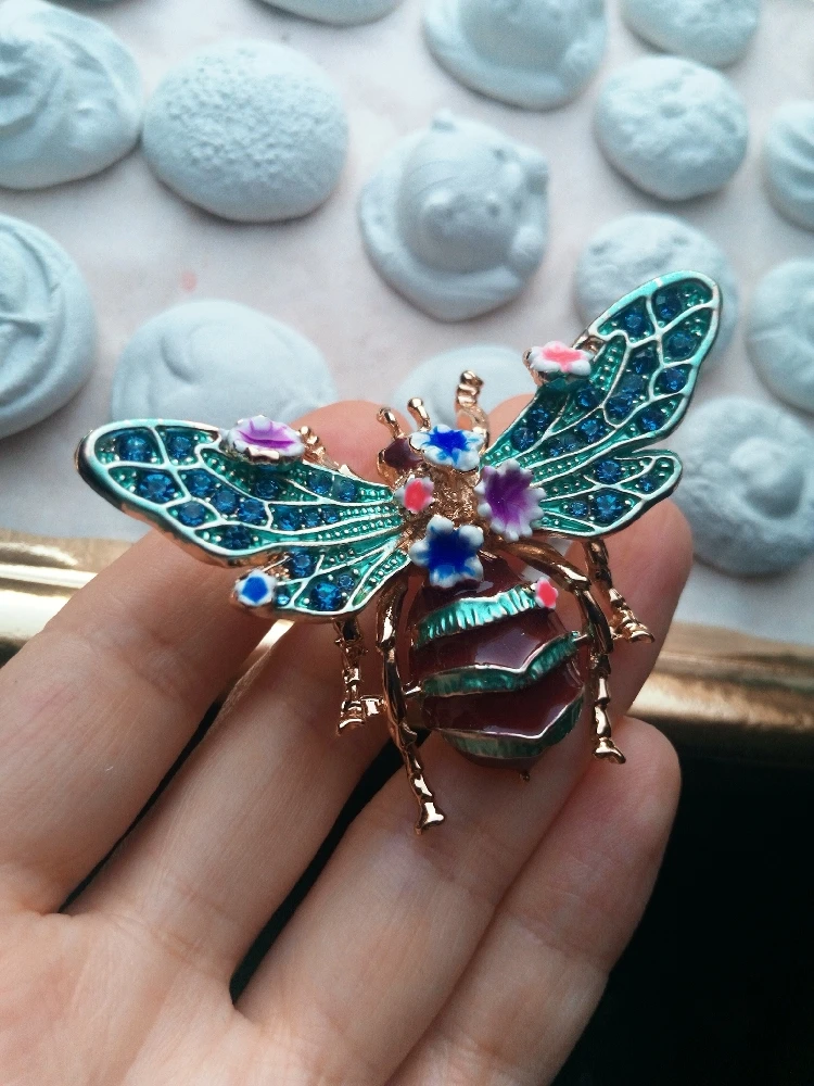 This pin is beautiful! It is very well done, in great detail, even the wings of the Bee have venations, its legs come out of the thorax and not the abdomen and it even has its stinger. The colors are very cute and bright and I like the flowers and the crystals that the insect has… A work of art! The delivery was fast and the packaging was very good. Looks durable. It is somewhat heavy as it is a large pin, but I think that the garment can be held well by placing a piece of foam or something thick on the inside of the garment just where the needle goes through.
