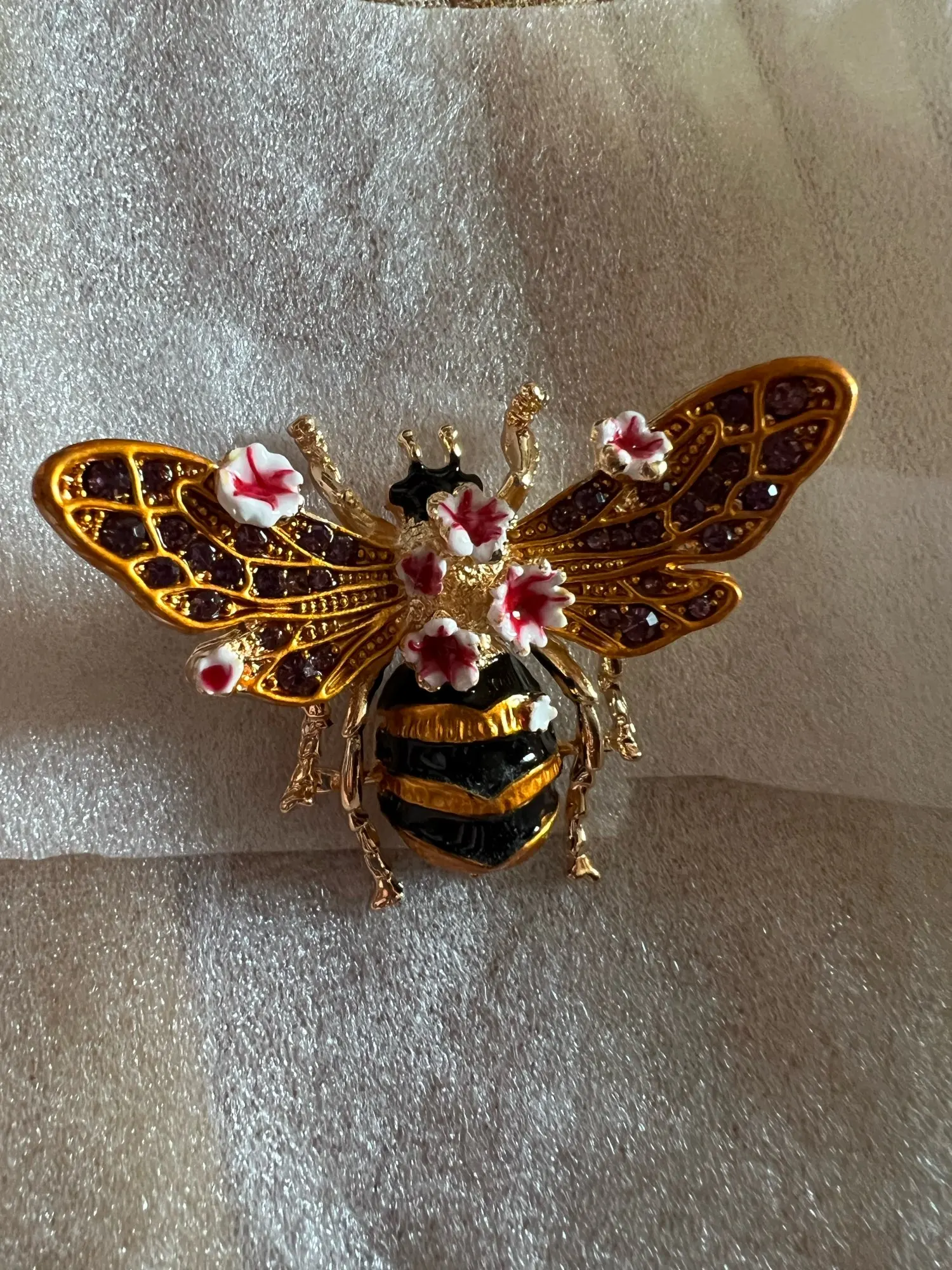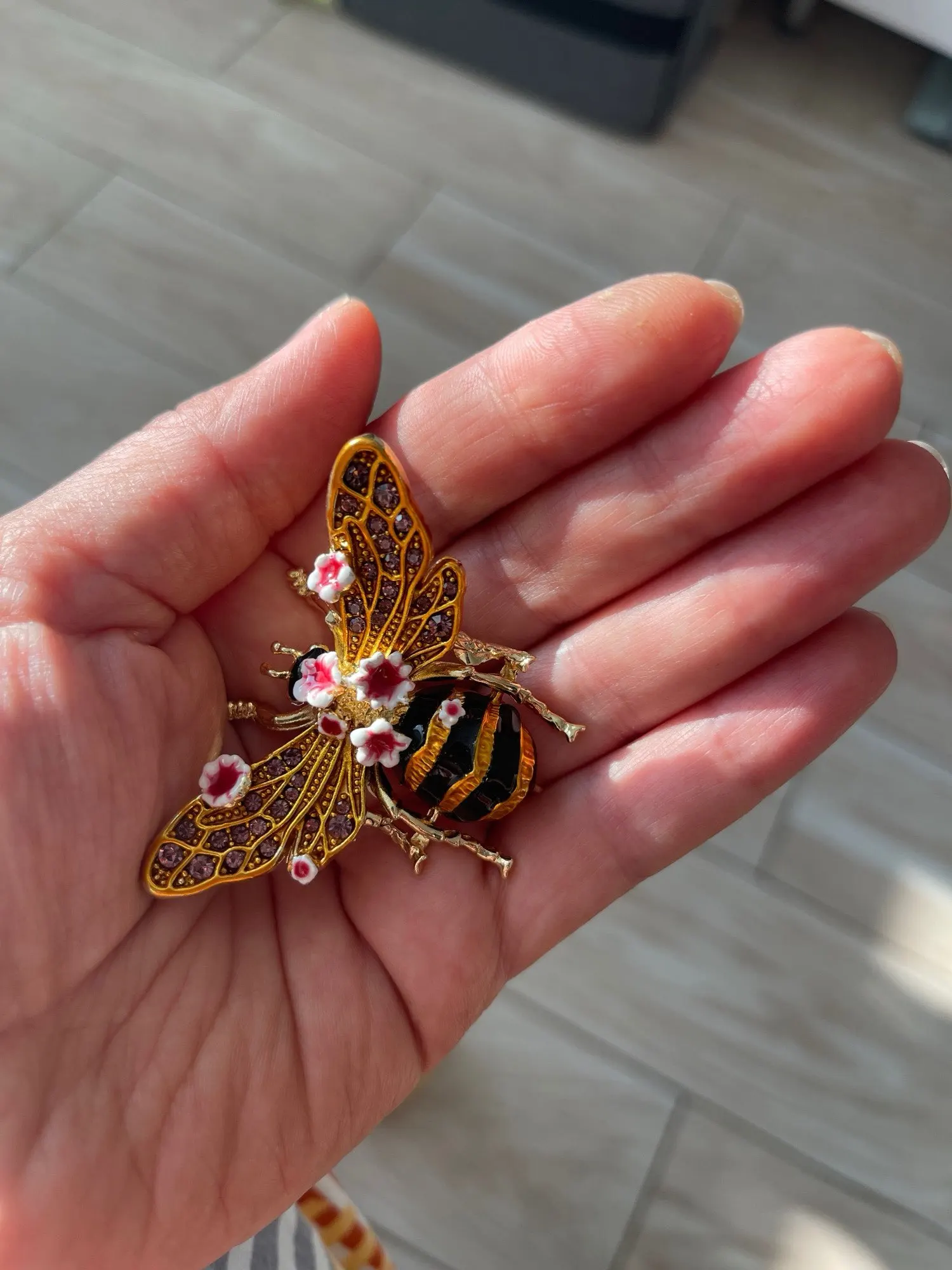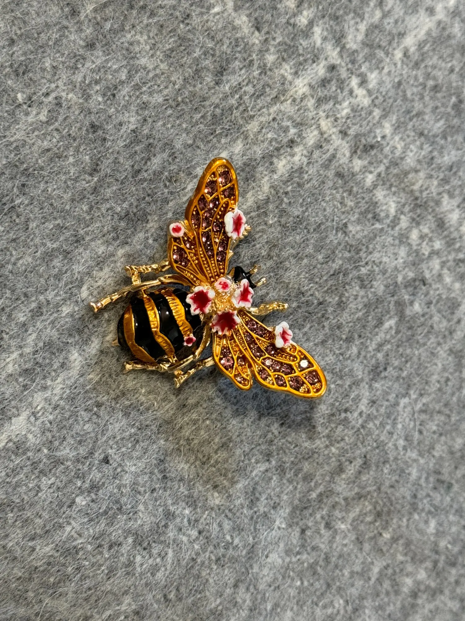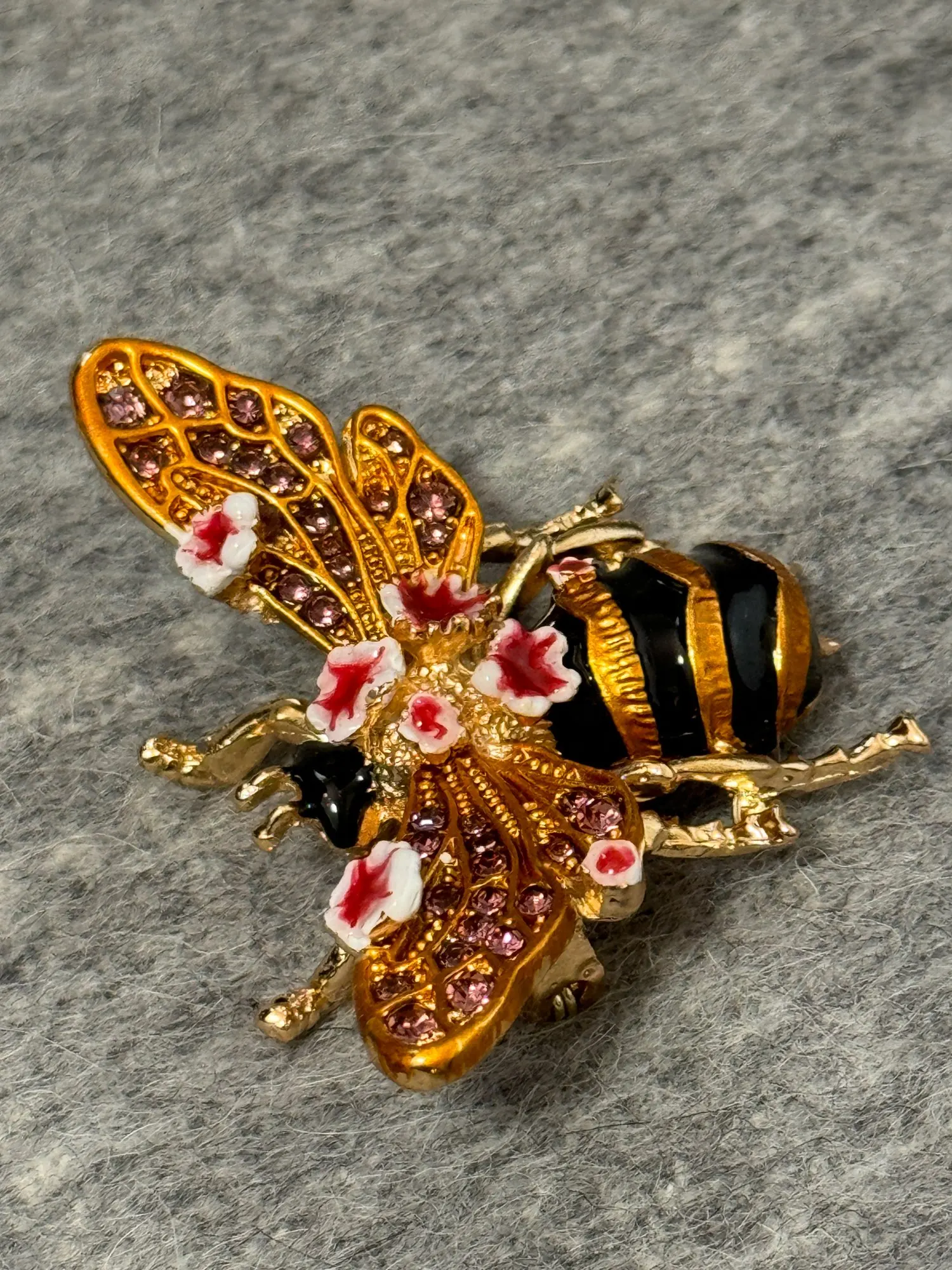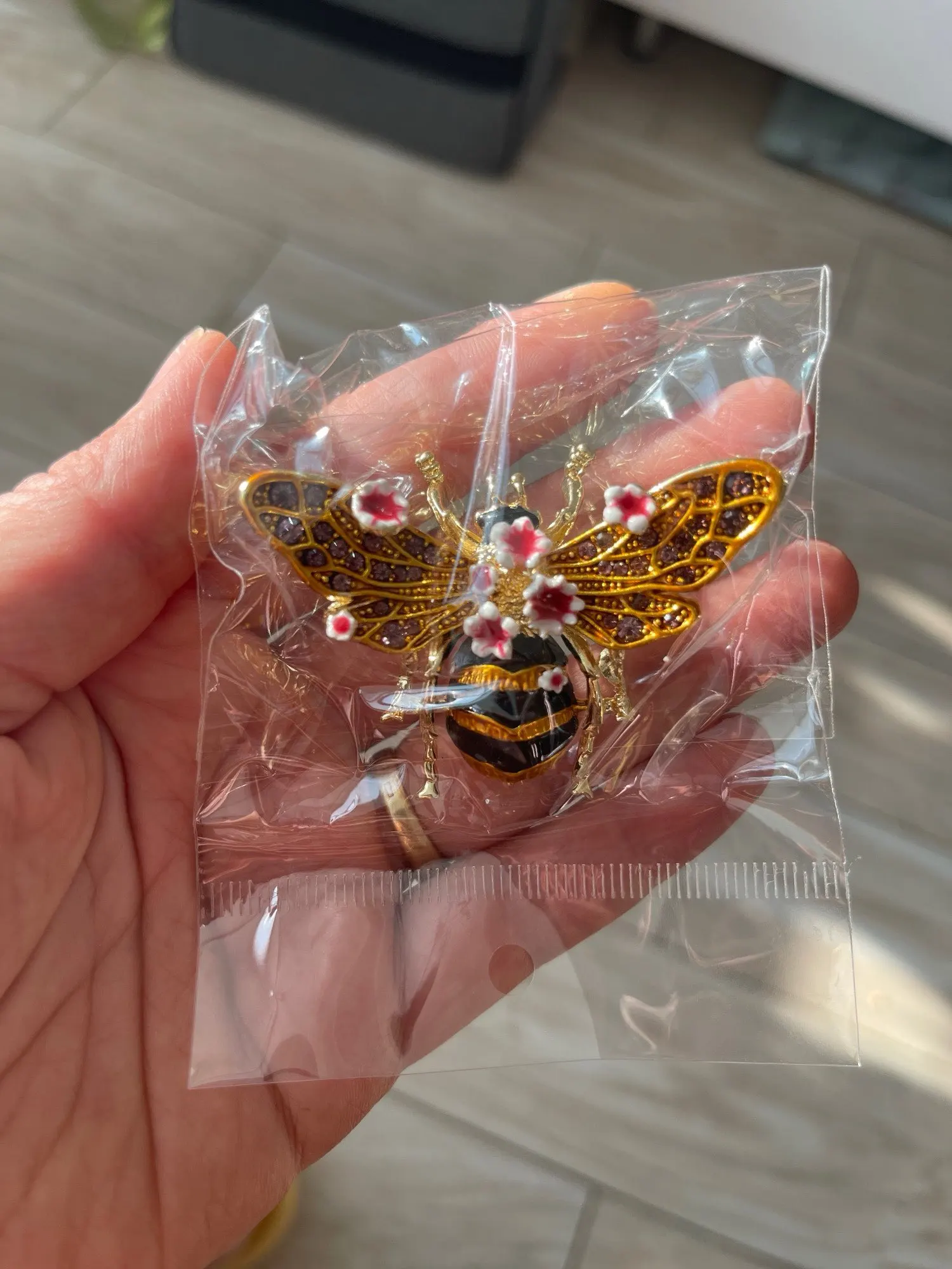 This pin is beautiful! It is very well done, in great detail, even the wings of the Bee have venations, its legs come out of the thorax and not the abdomen and it even has its stinger. The colors are very cute and bright and I like the flowers and the crystals that the insect has… A work of art! The delivery was fast and the packaging was very good. Looks durable. It is somewhat heavy as it is a large pin, but I think that the garment can be held well by placing a piece of foam or something thick on the inside of the garment just where the needle goes through.