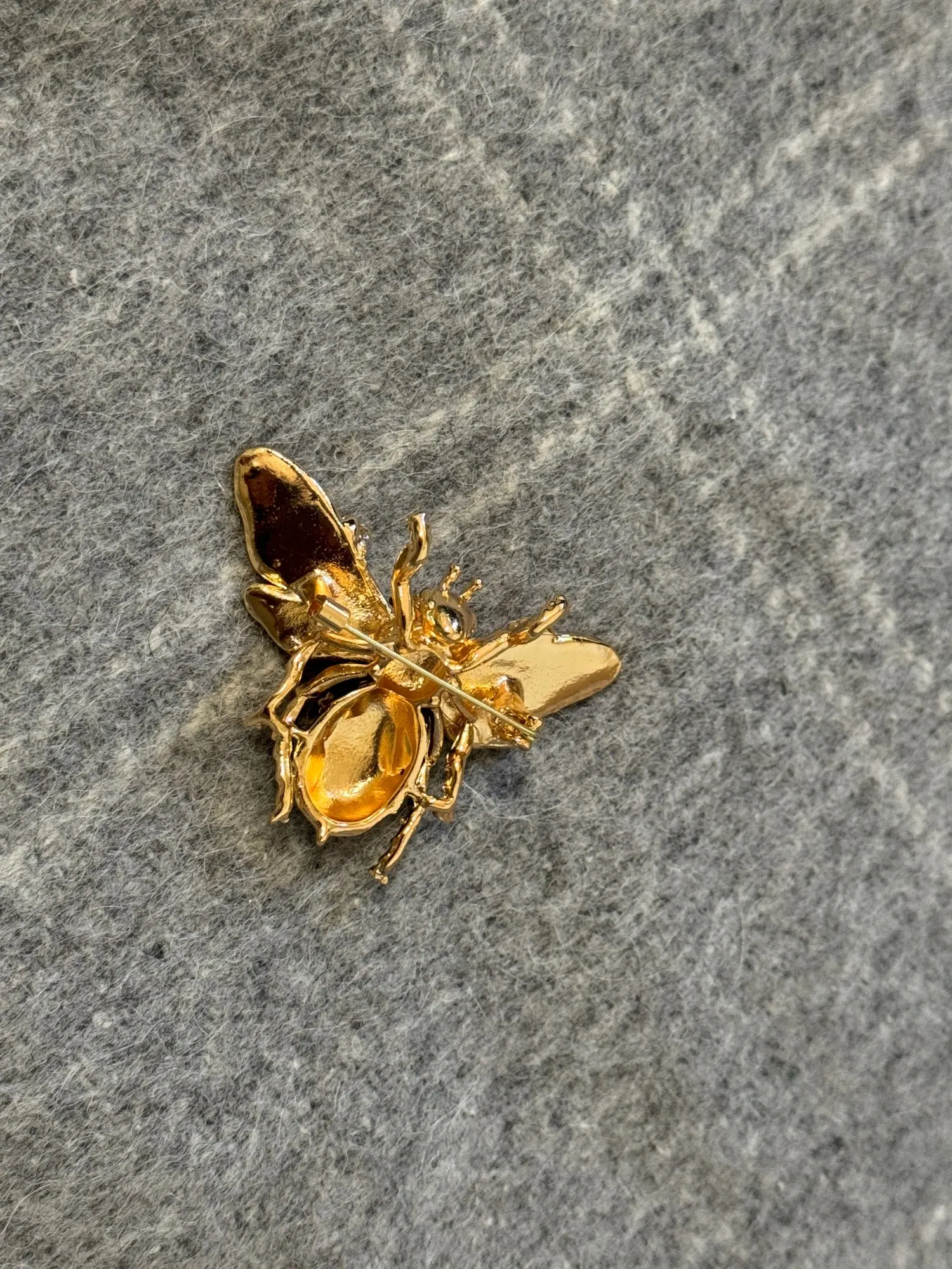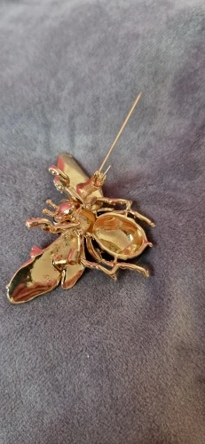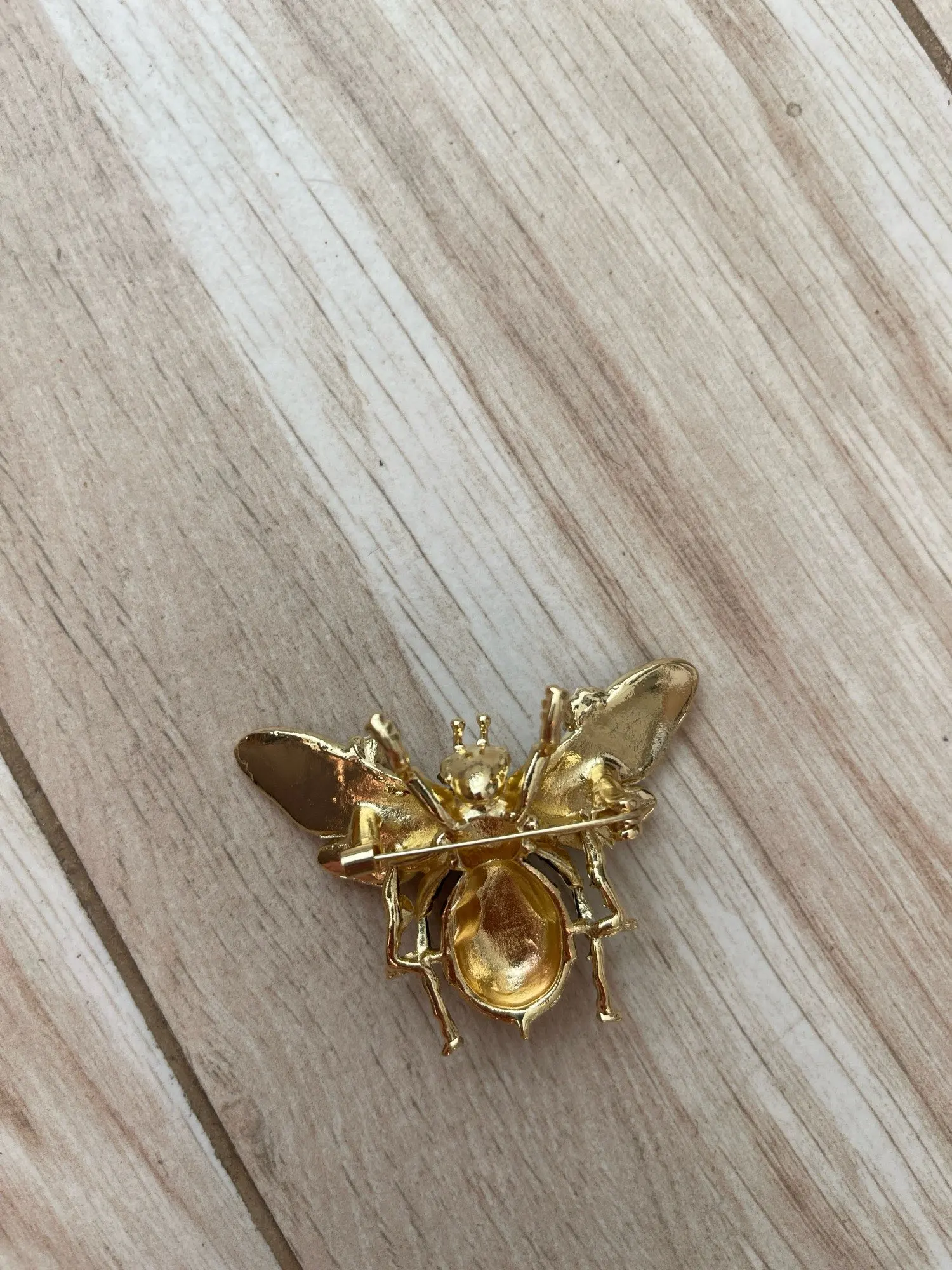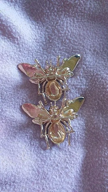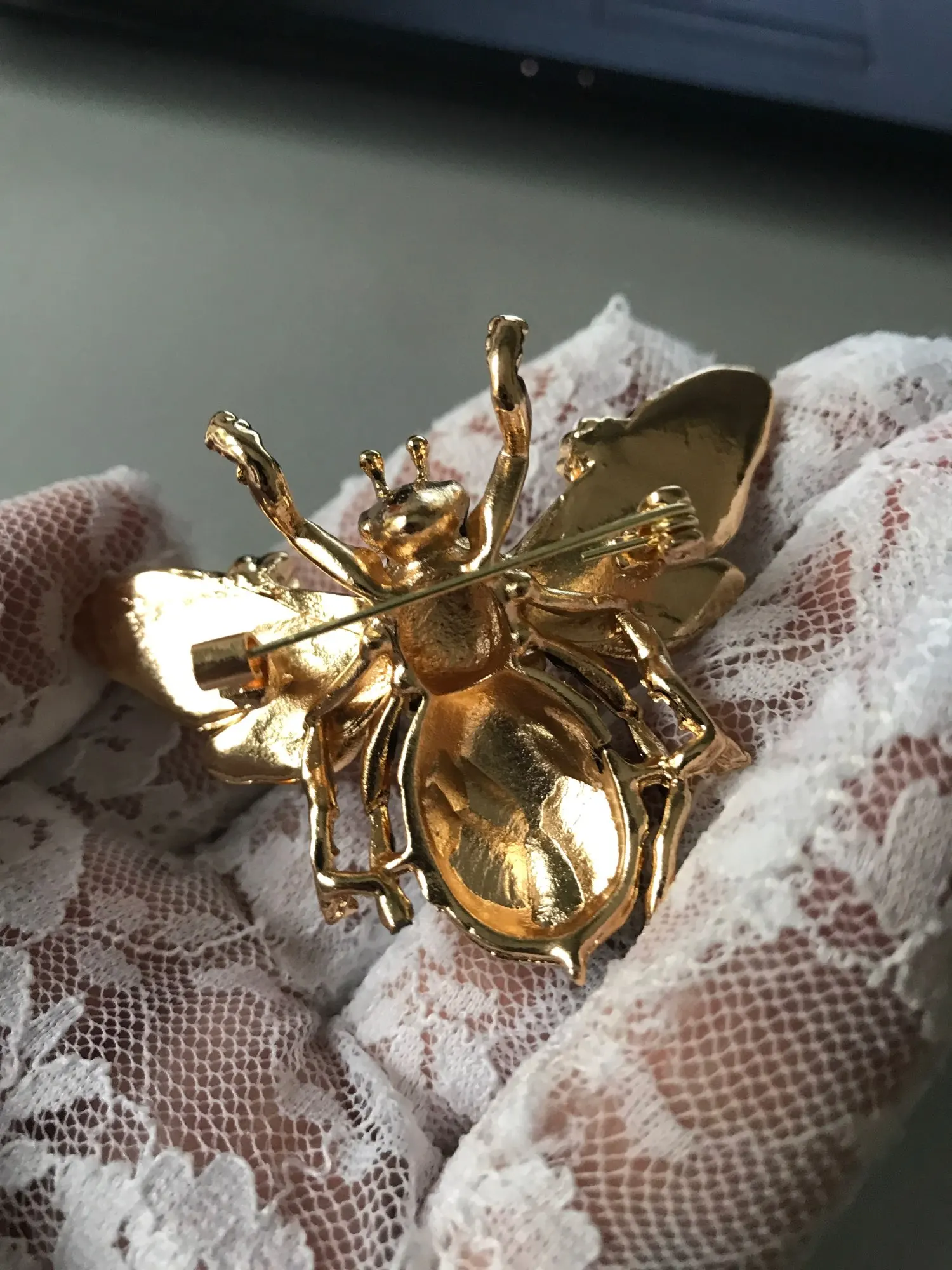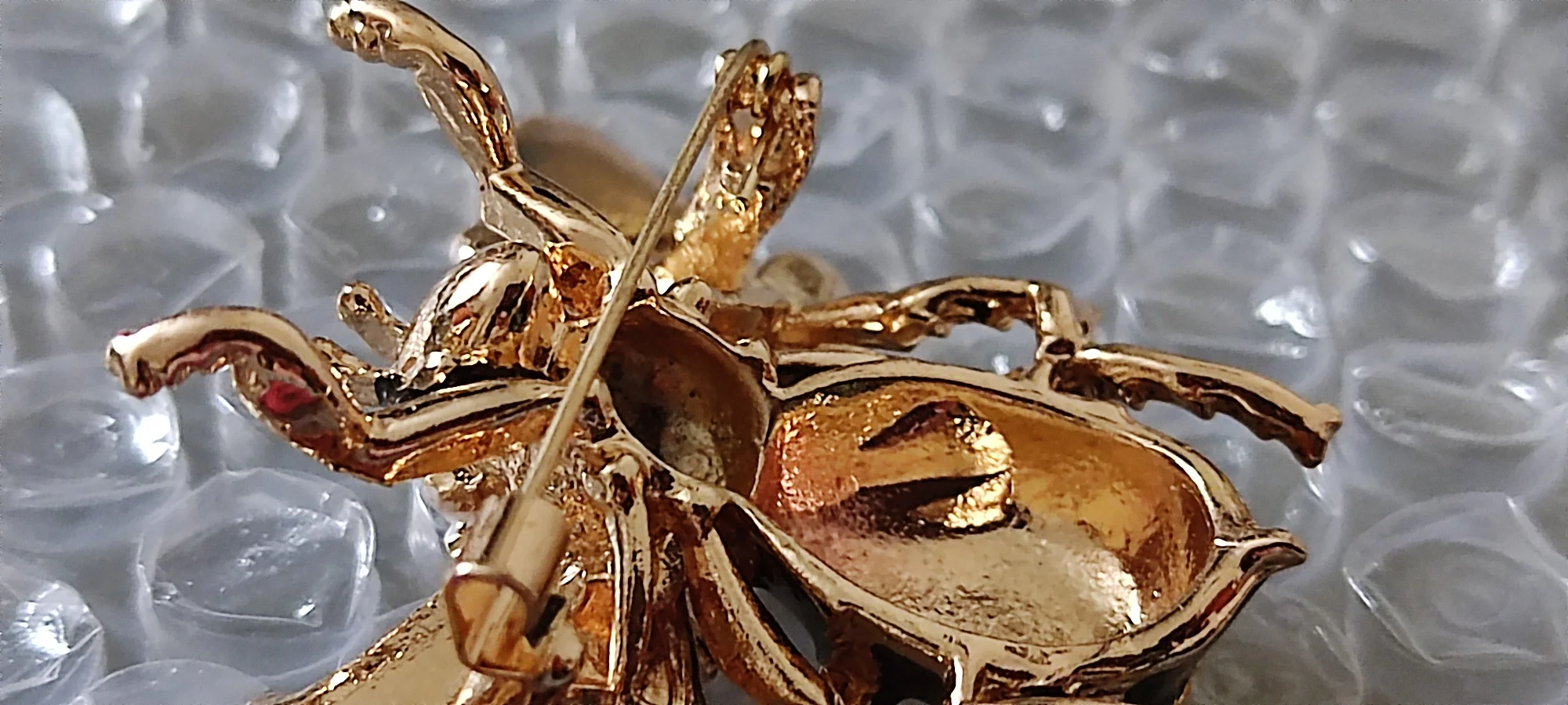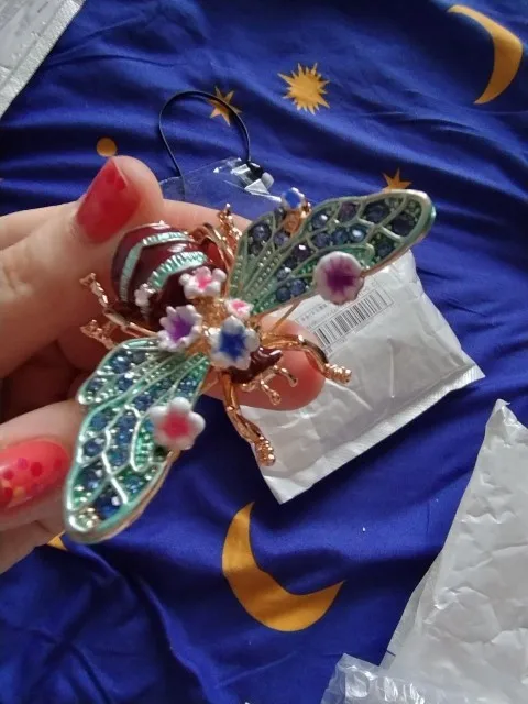 This pin is beautiful! It is very well done, in great detail, even the wings of the Bee have venations, its legs come out of the thorax and not the abdomen and it even has its stinger. The colors are very cute and bright and I like the flowers and the crystals that the insect has… A work of art! The delivery was fast and the packaging was very good. Looks durable. It is somewhat heavy as it is a large pin, but I think that the garment can be held well by placing a piece of foam or something thick on the inside of the garment just where the needle goes through.